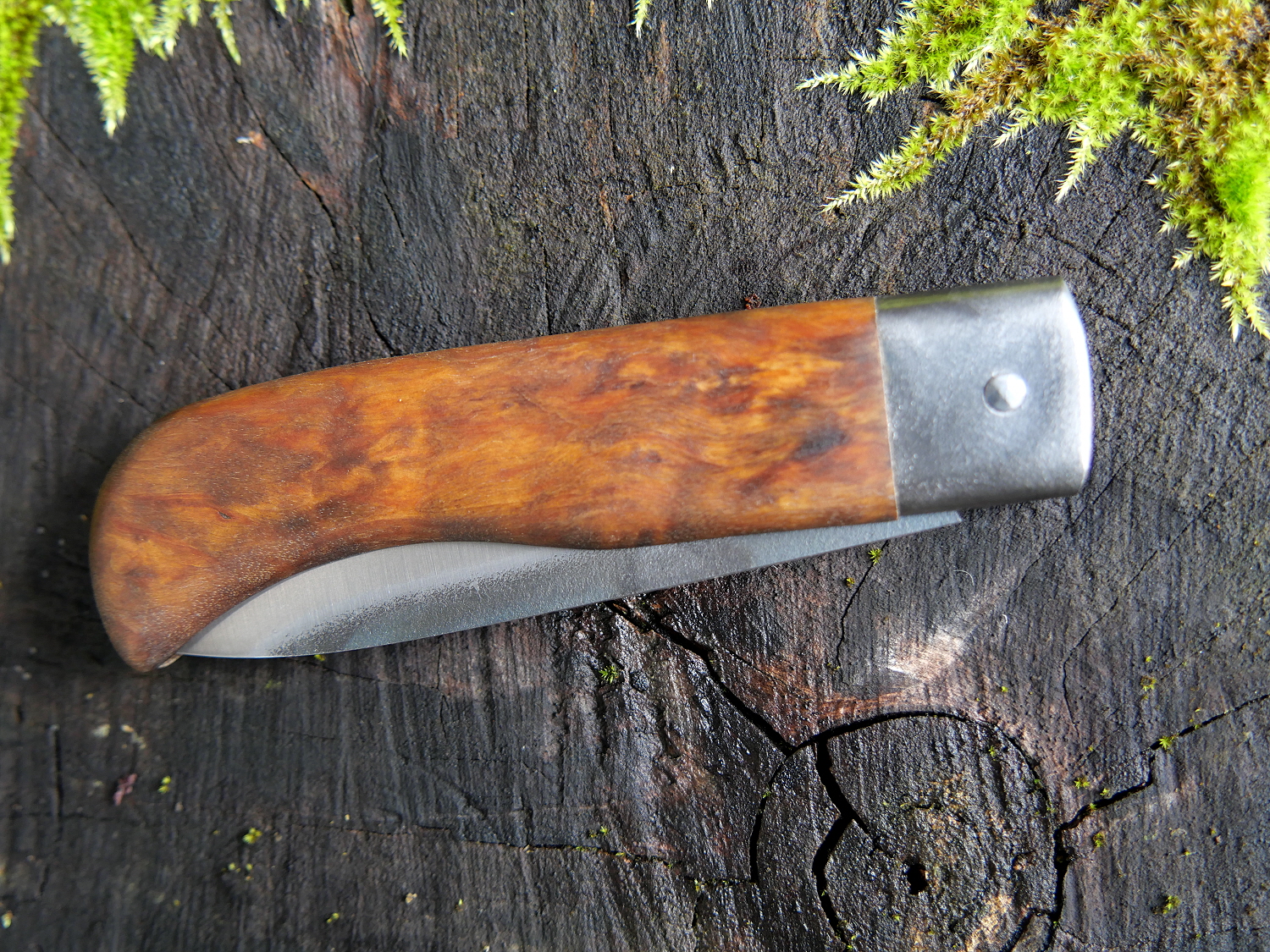 Avec lame en 90MCV8 , manche en bouleau madré et sa pochette cuir réalisée par